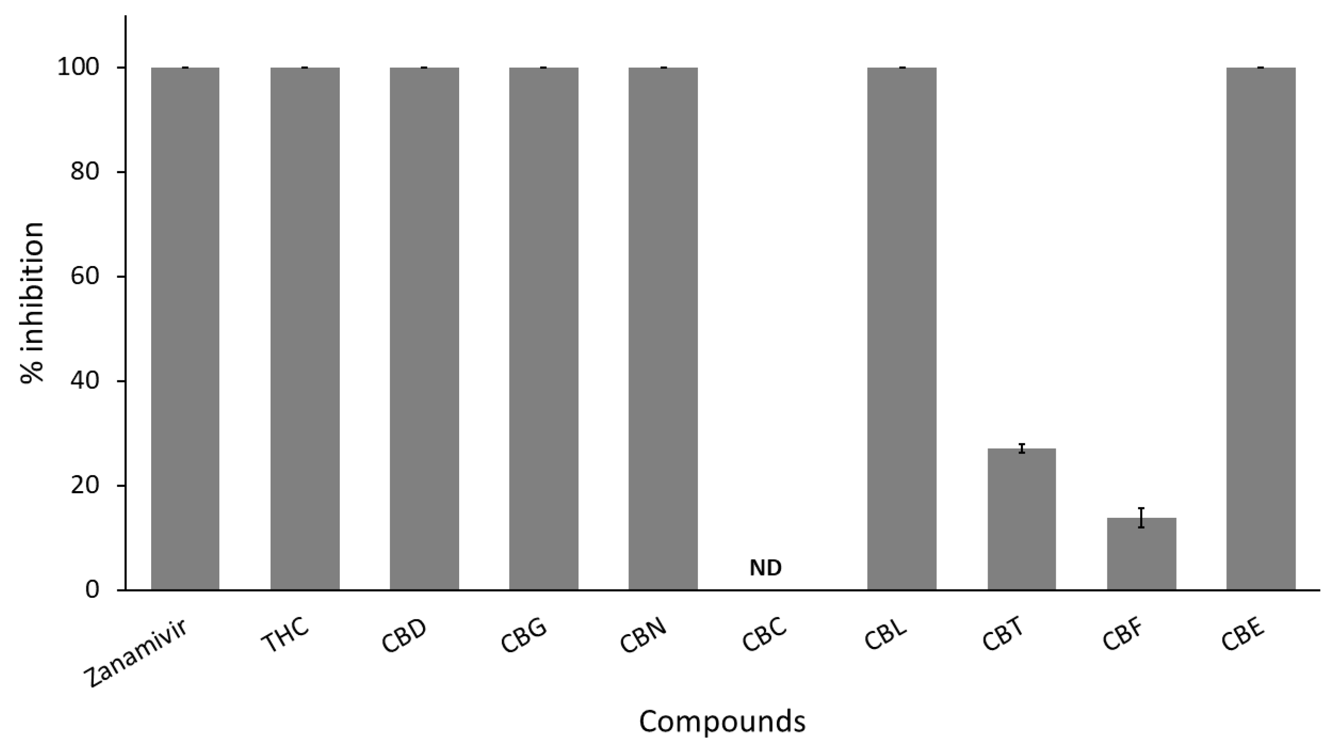 and CBN, completely inhibiting IAV neuraminidase activity (100% inhibition)." [4854]