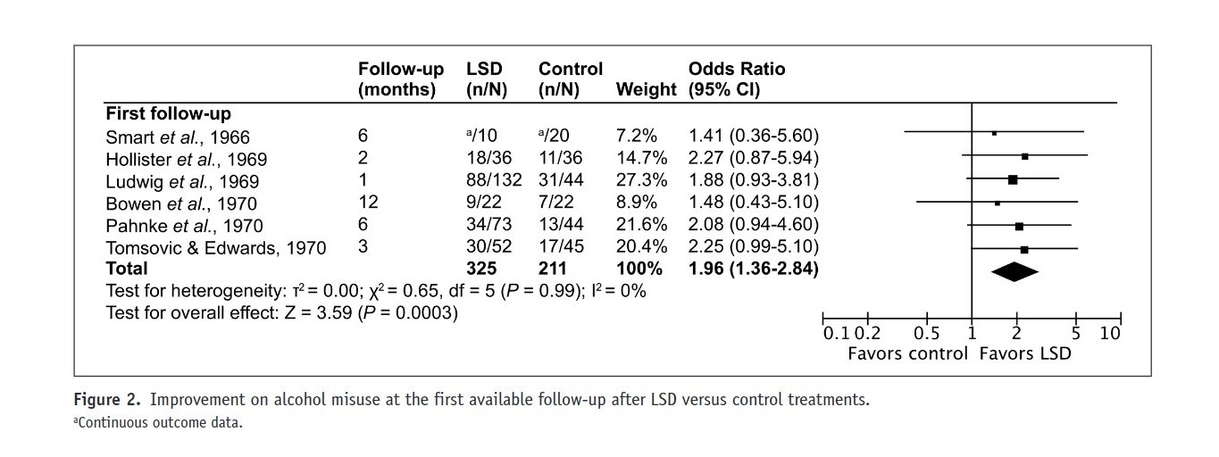 "The pooled odds ratio on improvement in alcohol misuse between the LSD and